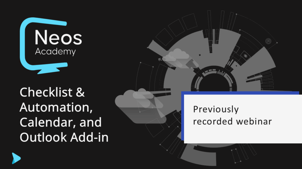 59:13 Neos Academy – Checklist & Automation, Calendar, and the Outlook Add-In In this previously recorded webinar, Pam Hodge & Lauren Root cover the Neos Checklist,...